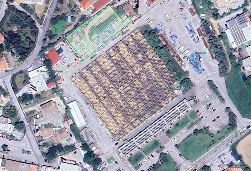 Il lotto, identificato al F. 104 P.lla 978 sub 2 e 3, è costituito da un’area urbana di 2.732 m² e da un’unità collabente costituita da rampa in c.a. per scarico e carico di materiali.